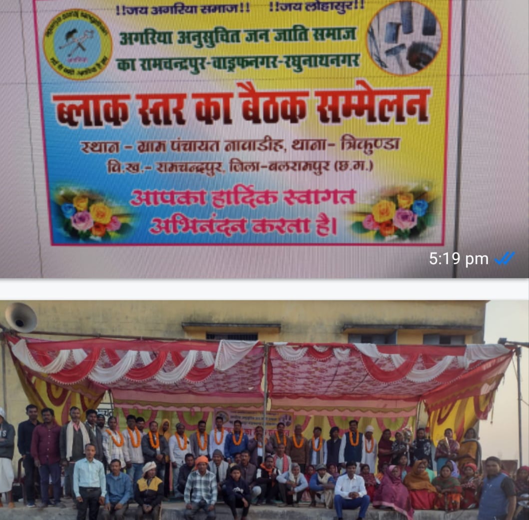 बलरामपुर जिला के विकास खंड रामचंद्रपुर के ग्राम पंचायत नवाडीह में अगरिया समाज का ब्लॉक स्तरीय बैठक का आयोजन किया गया था।जिसमें रामचंद्रपुर,वाड्रफनगर, रघुनाथनगर तीनों ब्लॉक के लोंगो ने भाग लिया साथ मे नवनियुक्त कार्यकारणी का गठन भी किया।गठन के पश्चात अगरिया समाज ने आज के युवा पीढ़ी को देखते हुए।नशा मुक्ति के सम्बंध समाज ने विशेष चर्चा किया,साथ मे शिक्षा से वंचित लोगो को शिक्षा से कैसे जोड़ा जाए ताकि समाज मे सुधार हो। तभी समाज के सभी वंचित लोग का सर्वागींण विकास संभव है।और इस कार्यक्रम में उपस्थित सम्भागीय अध्यक्ष श्री बैजनाथ अगरिया जिला के नवनियुक्त पदाधिकारी जिला उपाध्यक्ष अगरिया समाज के श्री धनपत अगरिया (वर्तमान जनपद सदस्य) ,कोषाध्यक्ष आनंद अगरिया, मीडिया प्रभारी भूलेश्वर राम ,सहसचिव रामधनी अगरिया, महामंत्री बिरसाय अगरिया, संरक्षक श्री सोनसाय रनते ,श्री राजकुमार अगरिया श्री रामशरण जी एवं रामचंद्रपुर ब्लॉक के अगरिया समाज के अध्यक्ष श्री राकेश अगरिया (जनपद सदस्य), वाड्राफनगर ब्लॉक के अगरिया समाज के अध्यक्ष श्री राम अगरिया सचिव श्री राजन अगरिया ,राम प्रकाश अगरिया समाज के मीडिया प्रभारी एवं भारी संख्या में महिला, पुरूष अगरिया समाज के उपस्थिति में बैठक सपन्न हुई।